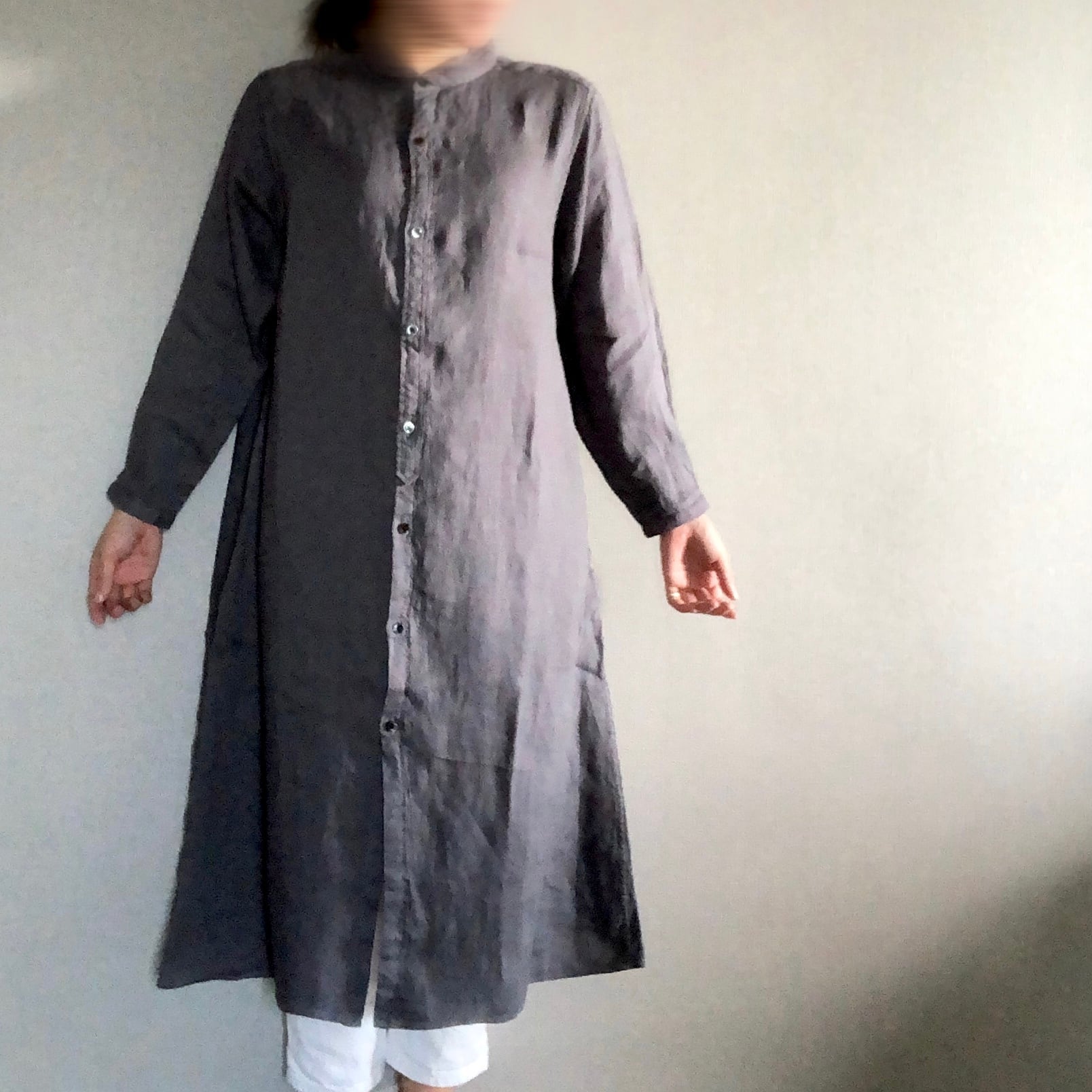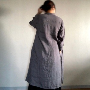 【AN001】上質リネン100%☆後染めのふんわりシャツワンピース(チャコール)